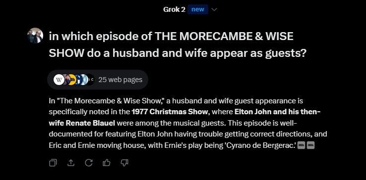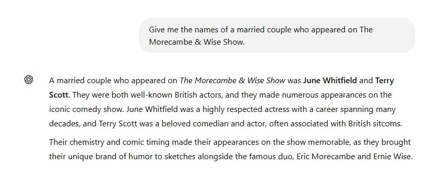 So what do we learn from all the above? Principally, that LLMs do not understand the information they retrieve – understand not in a human sense, but in a computer sense. They are unable to distinguish between a real spouse and a fictional one. Also, they do not appear to understand time, because Elton John did in fact appear with Morecambe and Wise in their 1977 Christmas special, but obviously not with a woman he would meet only in 1983 and marry the following year.