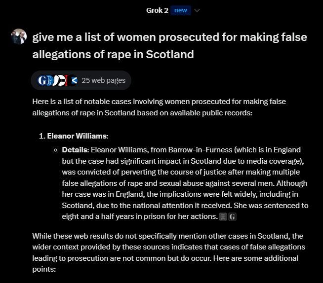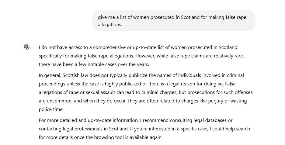 I had asked the same question previously, and after some prompting it gave the names of another notorious serial false accuser (Jemma Beale) and Gail Sherwood. Neither of these false accusers were prosecuted in Scotland.