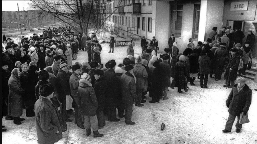 Without discussing the aspect of personal freedom, which of these systems delivers for ordinary people? Below is a photograph from Soviet Russia, 1985, a somewhat lengthy queue of shoppers. Did you ever see scenes like that in the United States? Possibly, when people are queuing up to buy the latest Apple phone release, but for essentials, bread, milk?