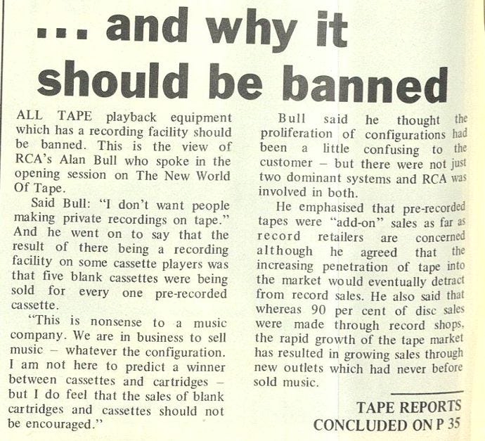 For anyone under the age of about thirty, the idea that taping music as in this case or video should be banned or could be banned must sound bizarre. For older people though, especially those of us old enough to remember a world where there was no social media, no YouTube, no public Internet, it is not so.